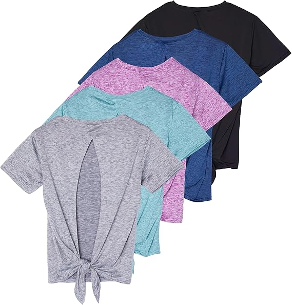 5 Pack: Women's Short Sleeve Open Back Tie Back Dry-Fit T-Shirt Yoga Gym Workout Top